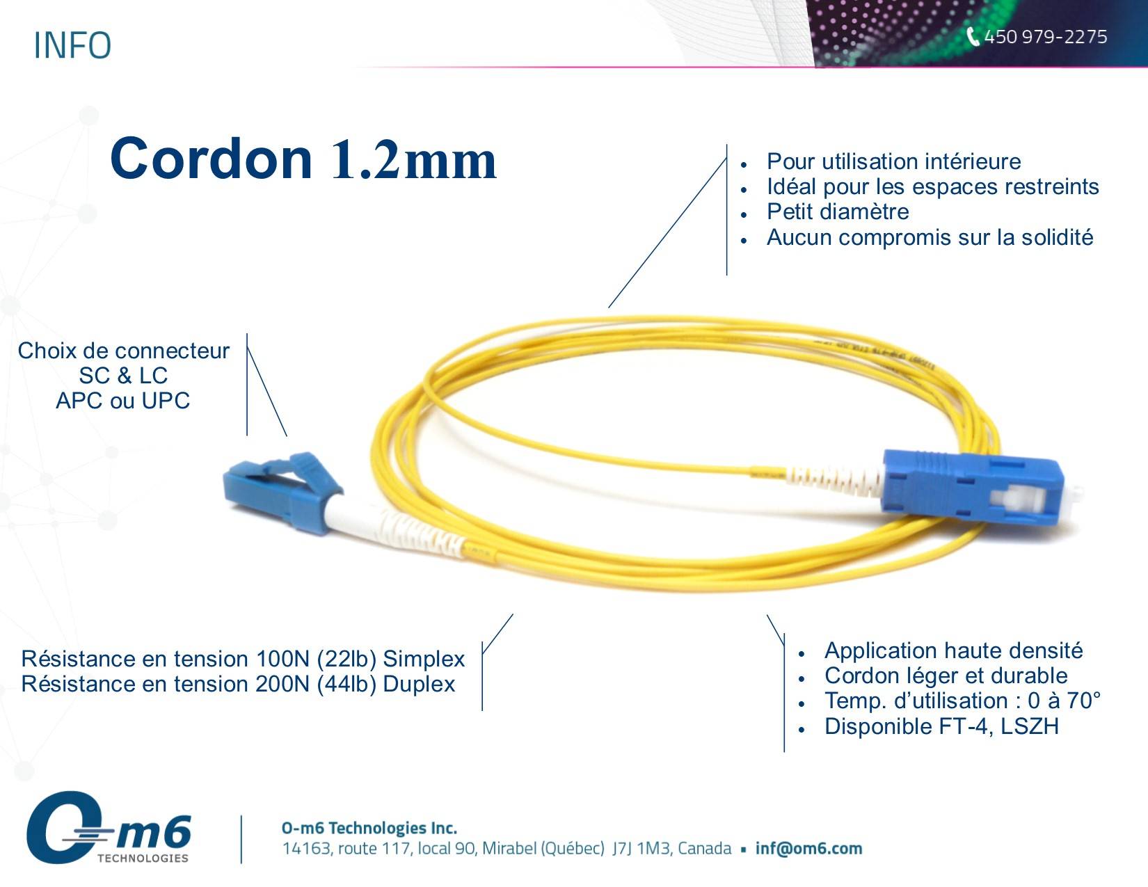 Les cordons et fibres d’amorce d’O-m6 sont fabriqués à partir des meilleurs matériaux existants. Ils ont été conçus, sans compromis, pour une utilisation fiable dans la plupart des applications. Ils sont disponibles dans une vaste gamme de connecteurs et fibres. Les produits standard sont disponibles en version 900 µm, 2 mm ou 3 mm. Ils peuvent également être fabriqués sur mesure pour satisfaire à des applications spécifiques telles que l’utilisation extérieure, en milieux rudes, en situation de température élevée ou de puissance élevée, etc.