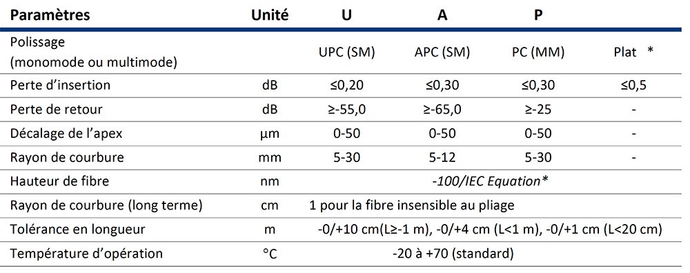 - Tous les connecteurs sont mis à l’essai à 850 nm (MM) et 1550 nm (SM), données fournies.